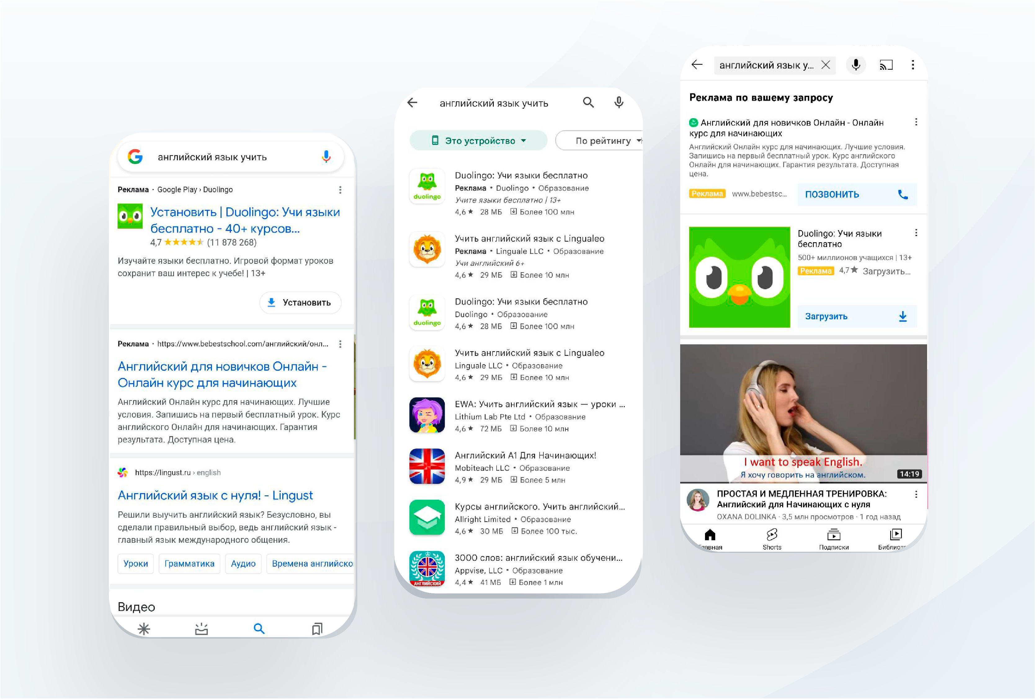 YouTube и Google Play ― два наиболее популярных сервиса техногиганта. Рекламная интеграция на этих площадках знакомит пользователей с вашей мобильной разработкой независимо от запросов.
